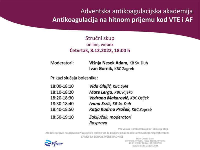 Pozivamo Vas da nam se pridružite i aktivno sudjelujete na virtualnoj radionici pod nazivom “Antikoagulacija na hitnom prijemu kod VTE i AF”.