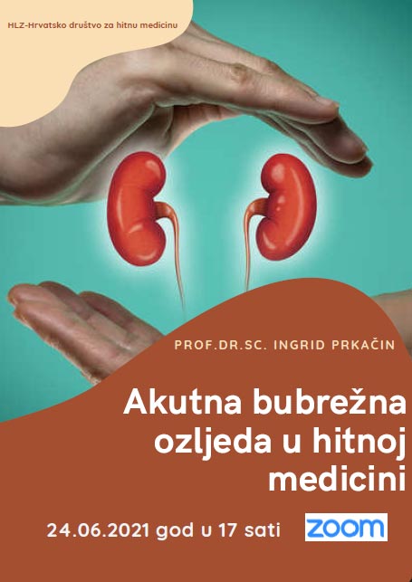 S veseljem najavljujemo stručno predavanje o akutnoj bubrežnoj ozljedi u hitnoj medicini. Predavač je prof.dr.sc. Ingrid Prkačin, dr.med., a vrijeme održavanja četvrtak, 24. lipnja 2021. godine u 17 sati. Za sve sudionike skup će biti bodovan od strane HLK.